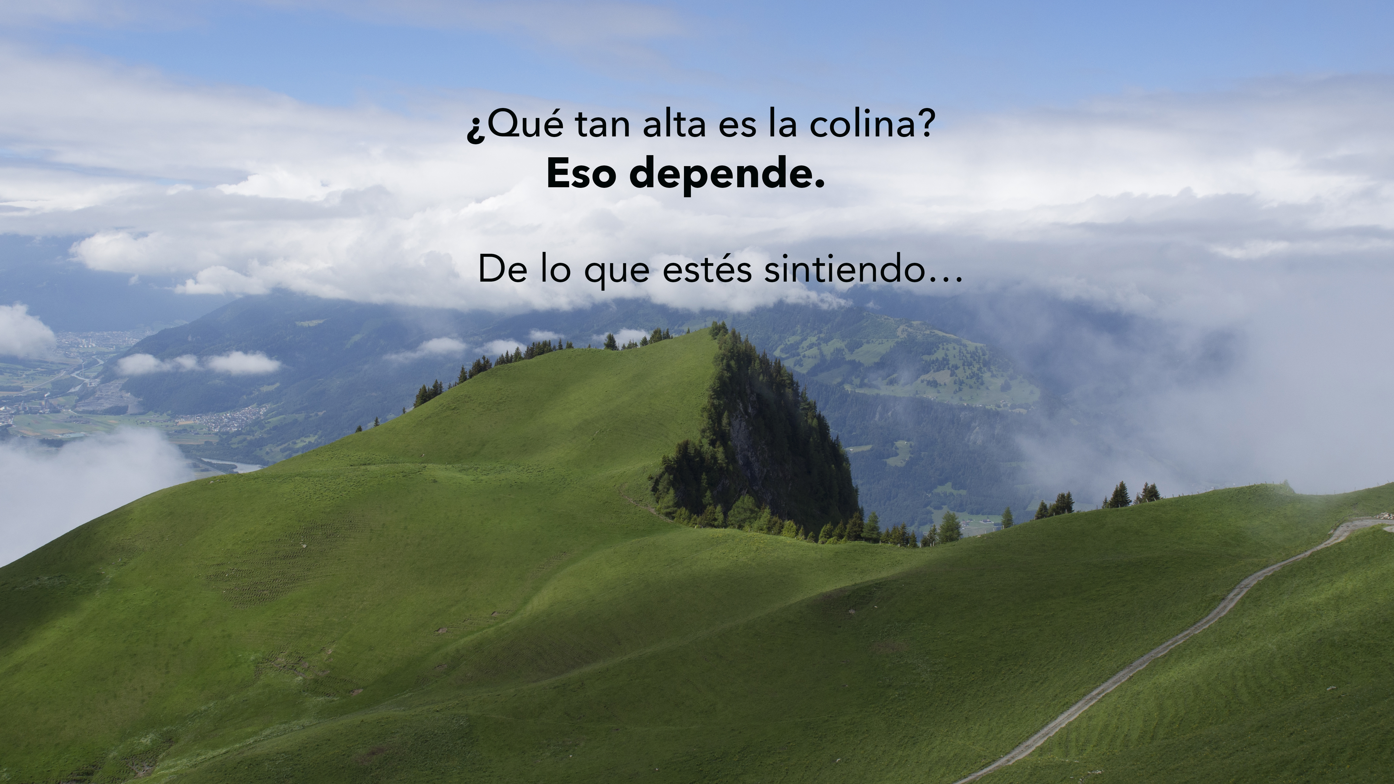 Los autores del estudio suponen que esto se debe a que la meta de nuestro cerebro no esta enfocada tanto en interpretar el mundo con exactitud, si no más bien en como asegurar nuestra supervivencia. Así que a pesar de que el procesamiento visual y las emociones son tradicionalmente vistos como funciones totalmente independientes, nuestra visión está realmente profundamente entrelazada con nuestro estado emocional. En realidad, son inseparables! Una colina parece mucho más inclinada para alguien que tiene bajos niveles de glucosa, la fuente primaria de energía para la actividad muscular inmediata. Así que cuando estás cansado, la colina se ve mucho más empinada que cuando estás lleno de energía. Pero no solo eso, además tu estado de ánimo también afecta cómo percibes la colina. Cuanto más triste estés, más empinada se verá ante tus ojos. Si estás feliz, no te va a parecer tan inconquistable Nuestras emociones literalmente cambian lo que vemos.