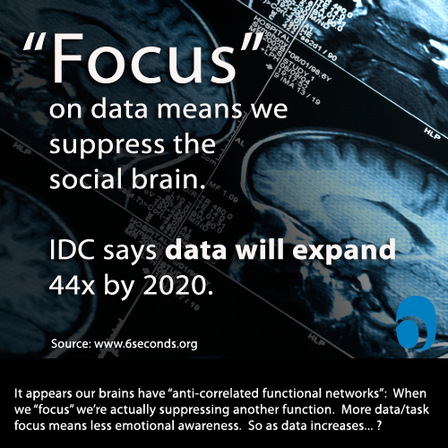 Un efecto lamentable del ritmo creciente de estrés, es la desactivación de las mismas partes del cerebro que más necesitamos para resolver los desafíos de hoy. Varios estudios de imágenes cerebrales han explorado la interacción entre nuestras funciones analíticas y sociales en el cerebro; por ejemplo este estudio de la Academia Nacional de Ciencias propone «redes funcionales anti-correlacionadas». Esto significa que cuando se activa un conjunto de funciones cerebrales (una red), se suprimen otras. Llamamos a esto «enfoque», y es esencial para hacer frente a la complejidad.