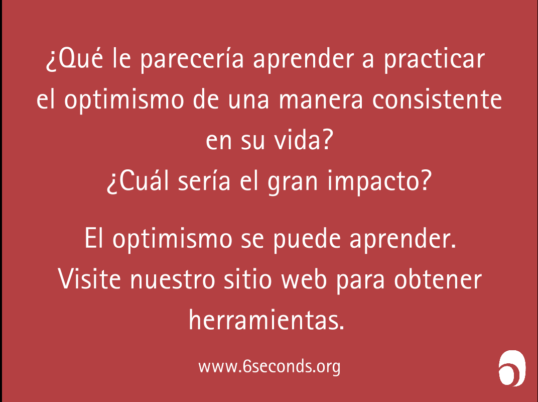 El objetivo de Six Seconds es tomar la ciencia emergente de la inteligencia emocional y ayudar a las personas a ponerla en acción. Así que escribimos artículos como estos y ofrecemos recursos gratuitos como estas diapositivas de optimismo con notas de los oradores. Si usted es un entrenador que trabaja con clientes, un líder en una empresa o un profesional para usted y su familia, tener las herramientas para practicar el optimismo es esencial.