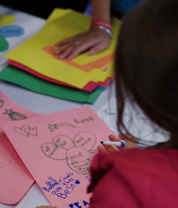 La actividad de los Círculos de Pertenencia de los Festivales POP-UP ayudó a las niñas del Festival de las Niñas a identificar todas las comunidades de las que forman parte. Un sentimiento de pertenencia es un componente clave para que cualquier niño prospere. La chica de la foto comparte que se siente amada por su madre, su padre y sus amigos. En tiempos difíciles, ella sabe de quién puede buscar apoyo. El Festival de las Niñas y los Festivales POP-UP reúnen a los niños con los adultos en sus vidas para que puedan aprender a apoyarse mejor.